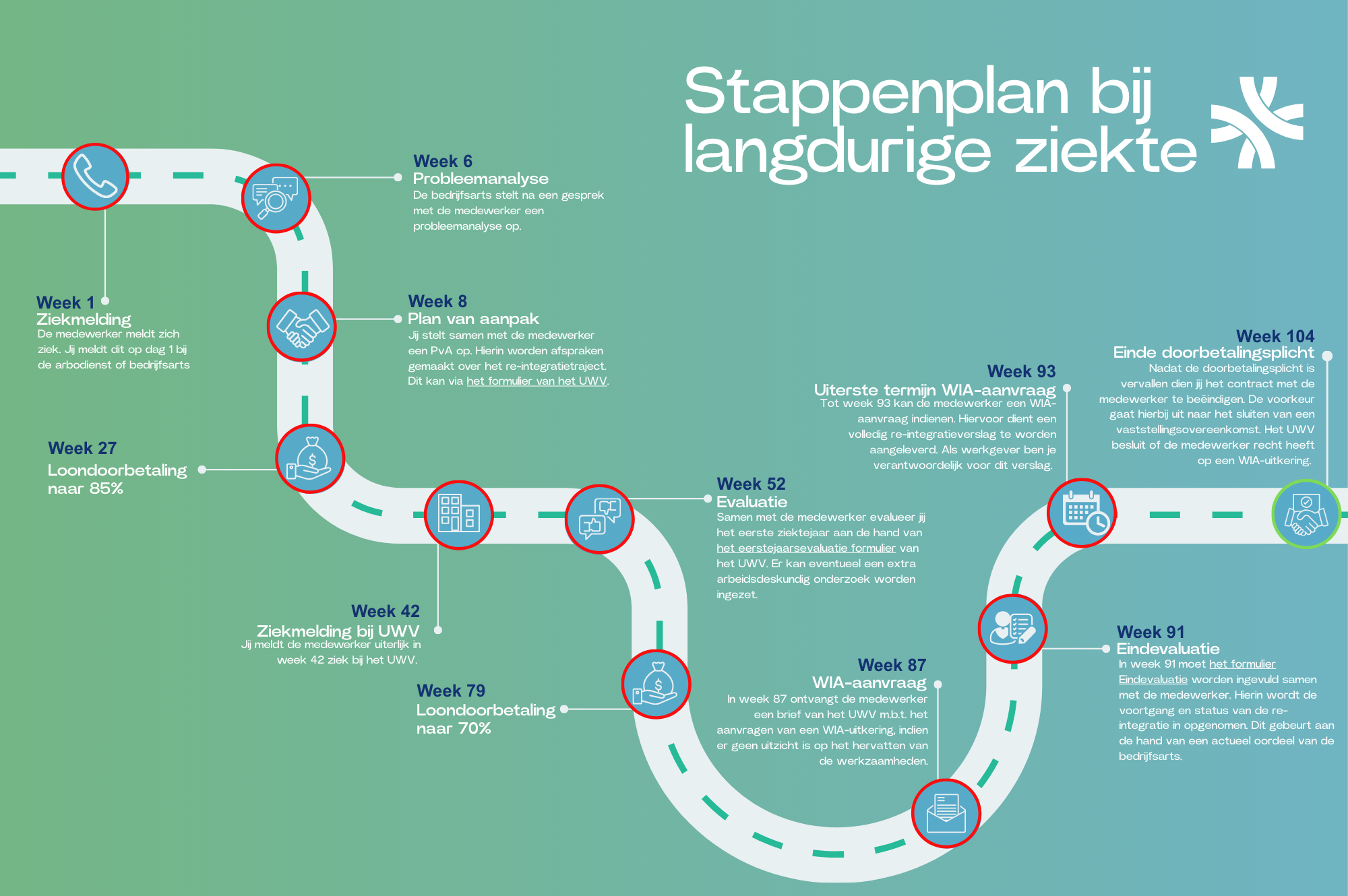 Hierin wordt het proces uitgelegd aan de hand van 9 stappen. Het is voor jou als werkgever belangrijk om je te houden aan deze stappen, je bent namelijk samen met de medewerker verantwoordelijk voor de re-integratie.