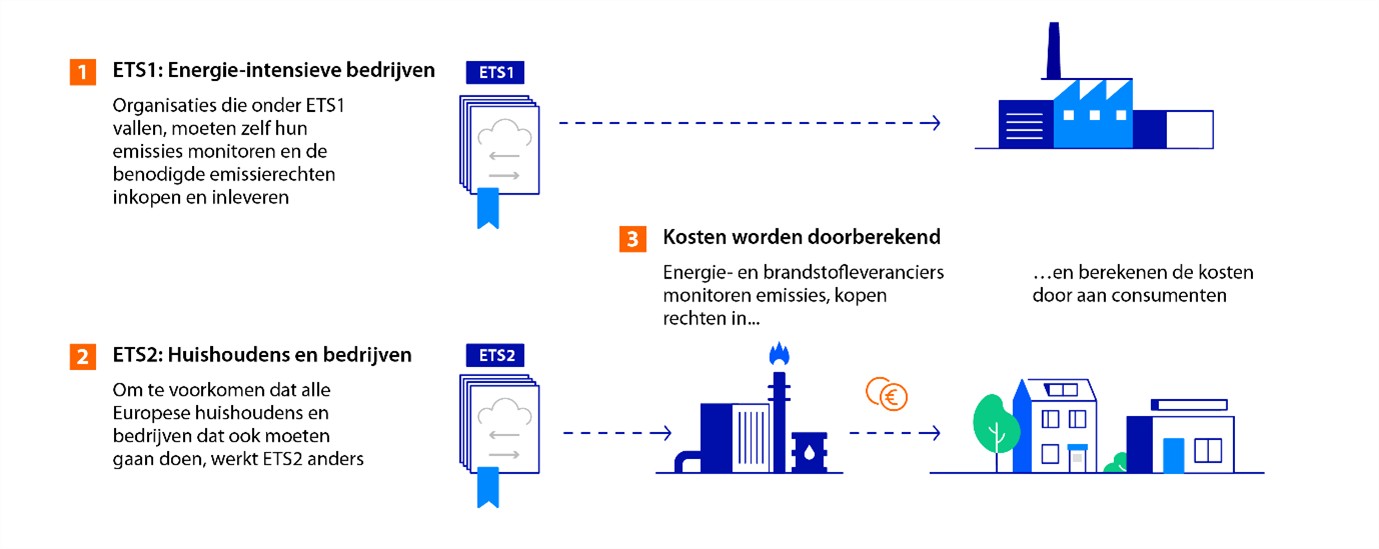 Organisaties die onder ETS1 vallen, moeten zelf hun emissies monitoren en de benodigde emissierechten inkopen en inleveren. Om te voorkomen dat alle Europese huishoudens en (kleine) bedrijven dat ook moeten gaan doen, werkt ETS2 anders.