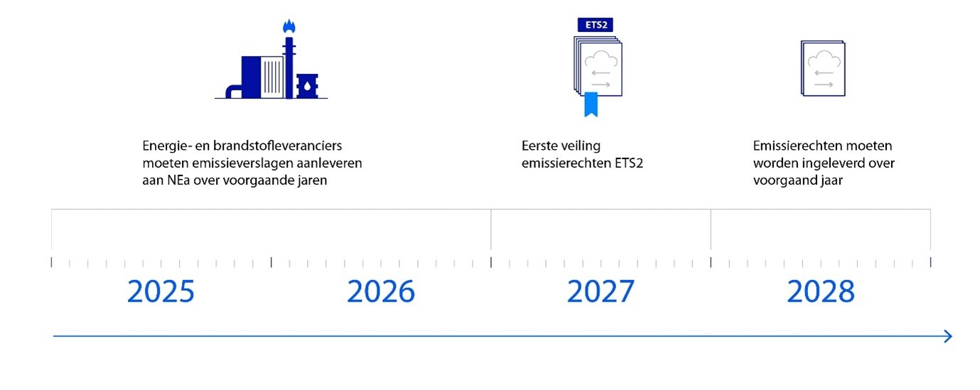 In 2025 en 2026 moeten energie- en brandstofleveranciers emissieverslagen aanleveren over de voorgaande jaren (2024 en 2025) aan de Nederlandse Emissieautoriteit (NEa). Er hoeven nog geen rechten te worden gekocht of ingeleverd. Het Europese emissiehandelsysteem ETS2 zou in 2027 starten, maar is uitgesteld tot 2028. Reden: lidstaten willen meer tijd voor voorbereiding. Volgens experts speelt ook politieke terughoudendheid mee.